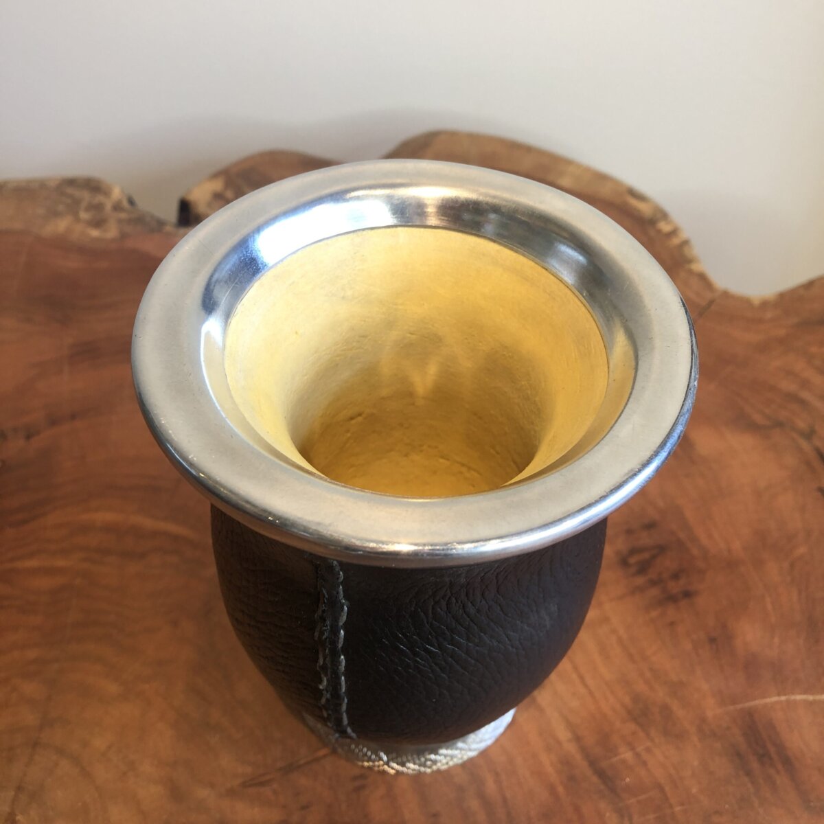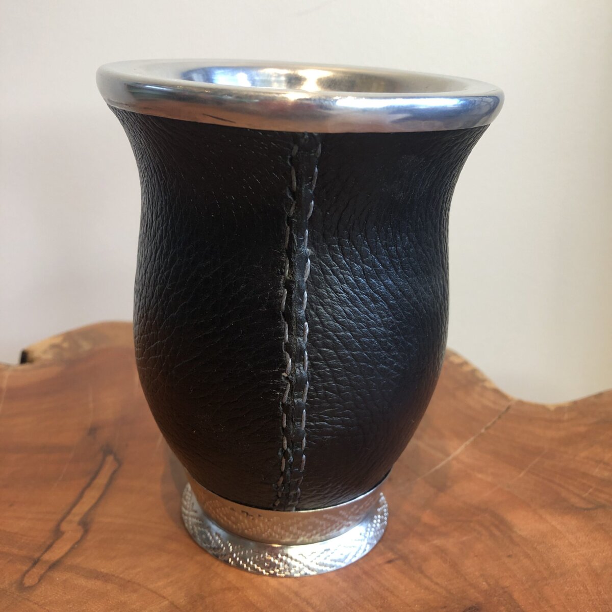 Cuia em Couro com bocal em inox e pé cromado. altura aprox 13cm