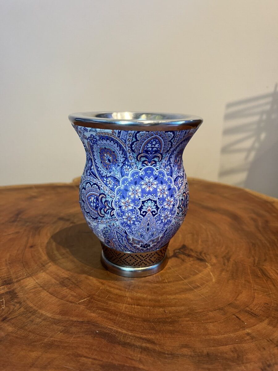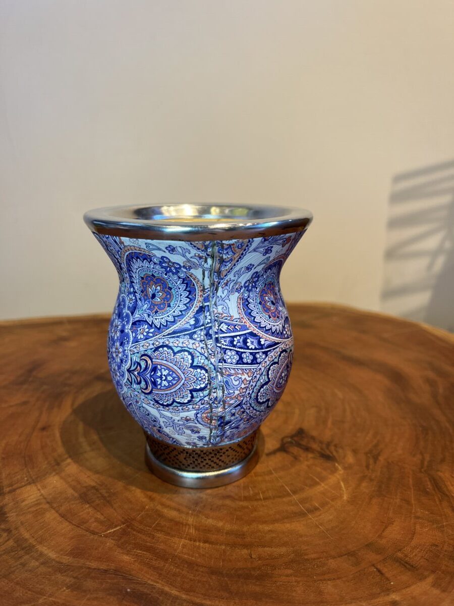 Cuia de porongo, com pé e bocal cromados, revestida em couro estampado com mandalas coloridos.
