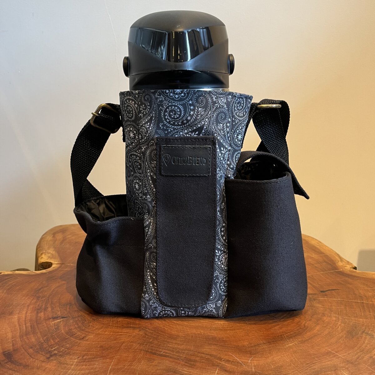 Possui bolsos para térmica, cuia, bomba de chimarrão e porta erva-mate. Modelo todo forrado com nylon para facilitar a limpeza e inibir a passagem de água.