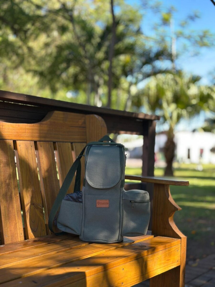 Suporta térmicas de até 2 litros. Possui bolso para cuia, porta erva, e um bolso extra para levar uns pila ou o celular.